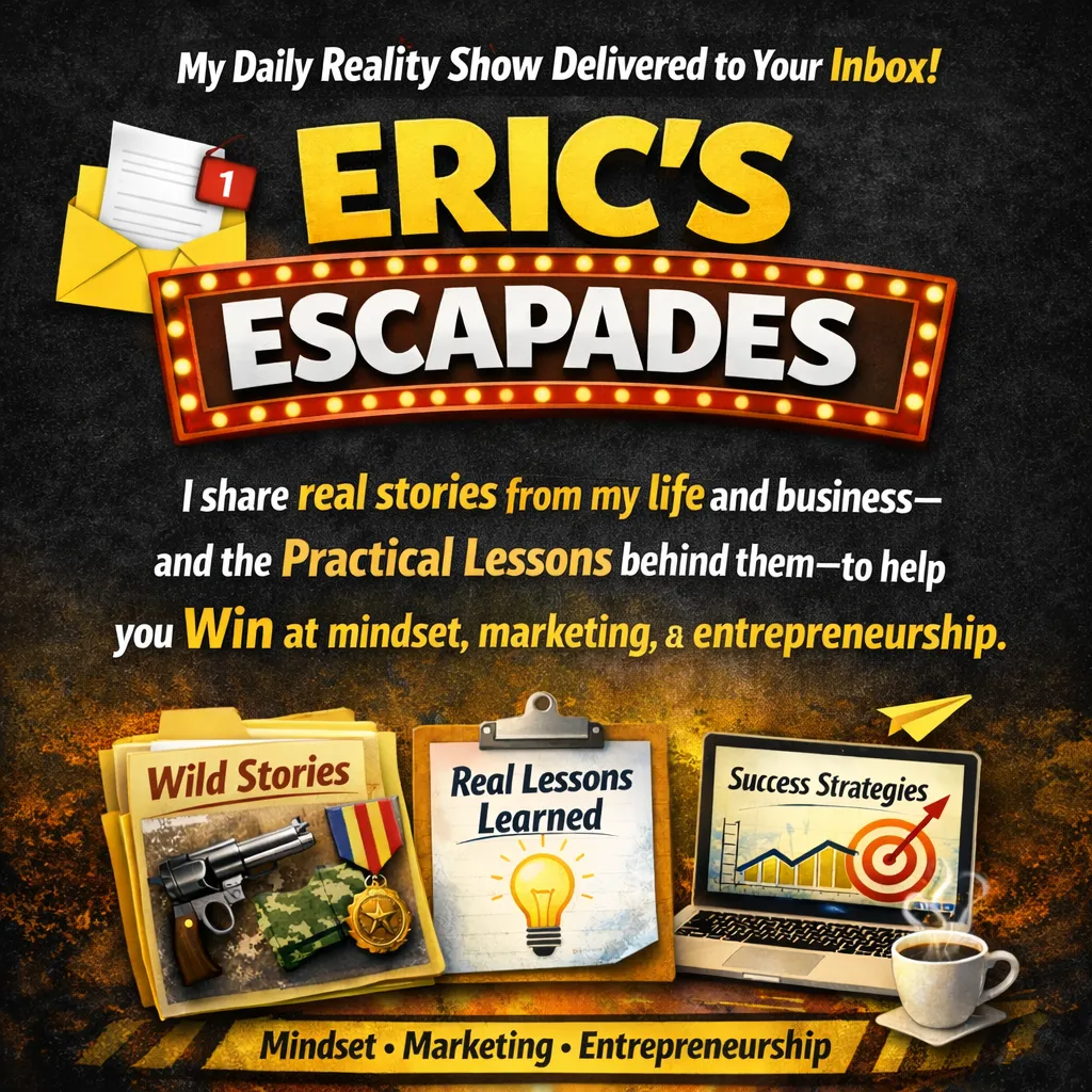 Eric’s Escapades is my daily reality show delivered to your email inbox. I share real stories from my life and business—and the practical lessons behind them—to help you win at mindset, marketing, and entrepreneurship. Every episode breaks down what actually happened, what it taught me, and how you can use it right away. It’s an entertaining and empowering way to start your day.
